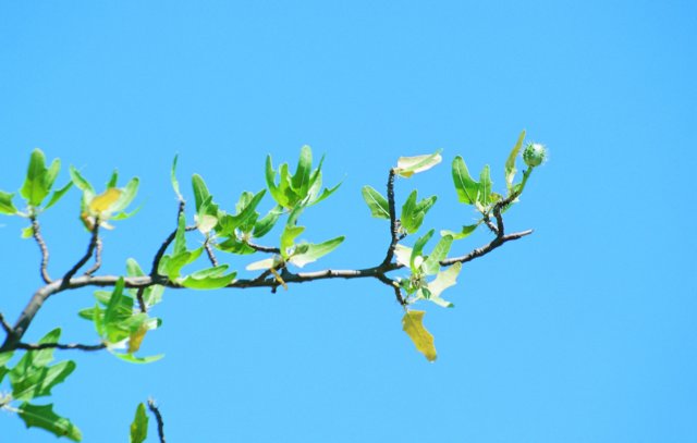 Detalhe do ramo com flores e folhas da planta faveleiro sem espinho.