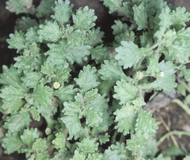 Detalhe do ramo com folhas e botões florais da planta macela.