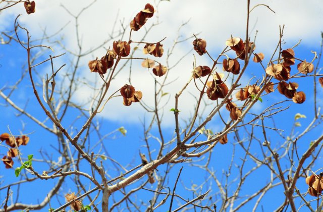 Detalhe do galho com flores e folhas da planta Mofumbo.