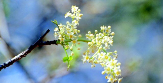 Detalhe do ramo com folha com flores da planta Umbuzeiro.